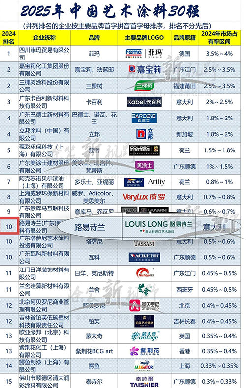 备受瞩目的“2025年中国艺术涂料30强”榜单正式发布。路易诗兰艺术涂料把握商业机遇,