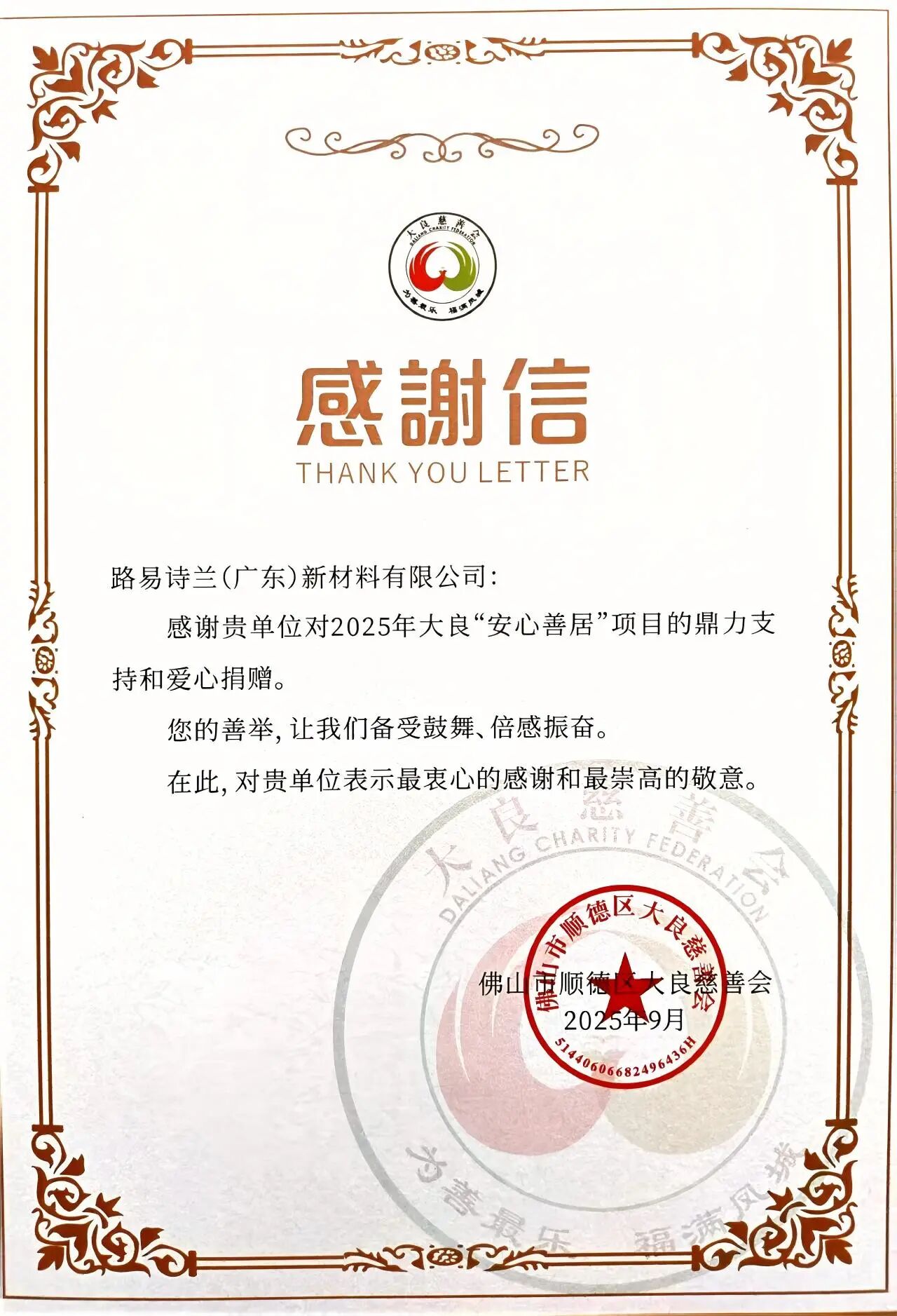 作为行业共同发展的一份子,路易诗兰(广东)新材料有限公司捐赠800平方米高性能防水艺术涂料,专项用于2025年“安心善居”项目受惠家庭的屋顶、墙面修缮。